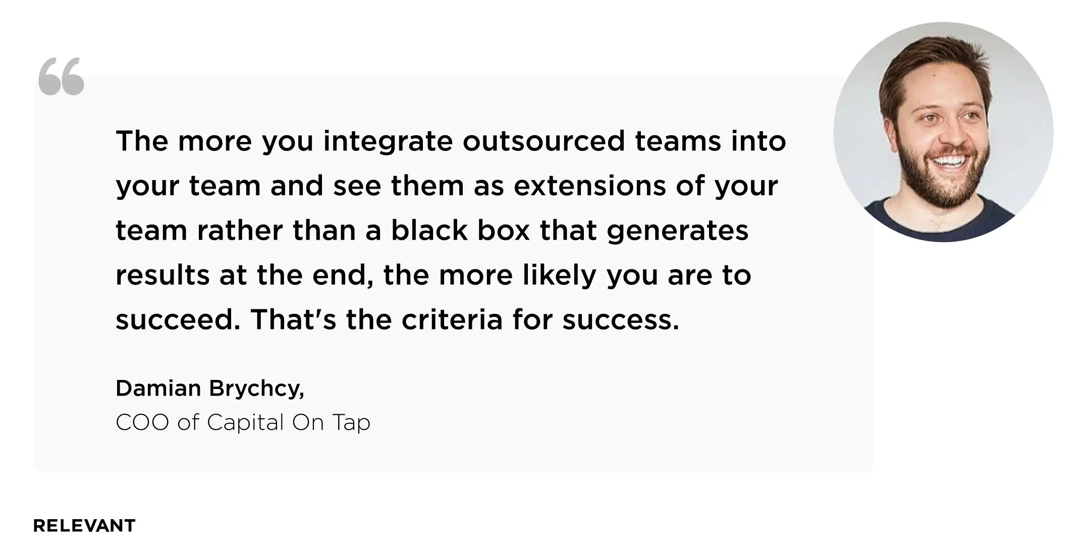Now, when they outsource vendors, they first determine whether or not these individuals are culturally compatible with the way they operate at Capital On Tap. Damian suggests asking yourself, upon choosing a vendor, whether they seem like an extension of your team.