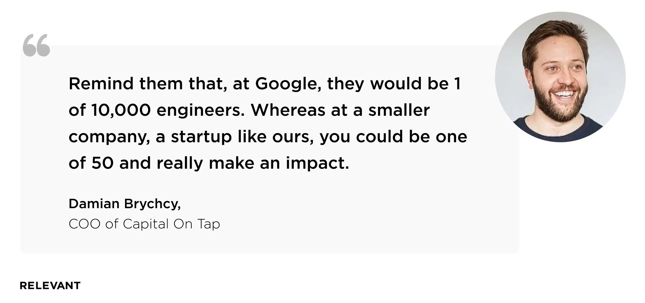 “Remind them that, at Google, they would be 1 of 10,000 engineers. Whereas at a smaller company, a startup like ours, you could be one of 50 and really make an impact. You will have that job satisfaction and be given the floor to solve really hard problems”.