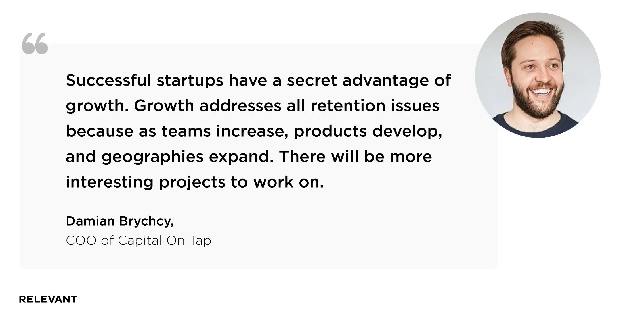 If you recruit the appropriate individuals and deliver on your promises, I believe many will remain because they see the growth. Successful startups have a secret advantage of growth. Growth addresses all retention issues because as teams increase, products develop, and geographies expand. There will be more interesting projects to work on. I believe it’s where startups have a secret advantage.”