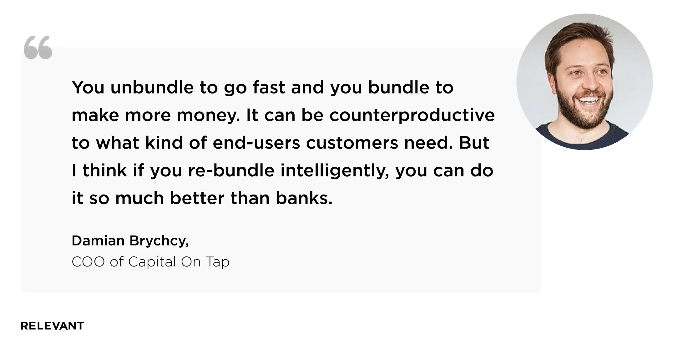You unbundle to go fast and you bundle to make more money. It can be counterproductive to what kind of end-users customers need. But I think if you re-bundle intelligently, you can do it so much better than banks.