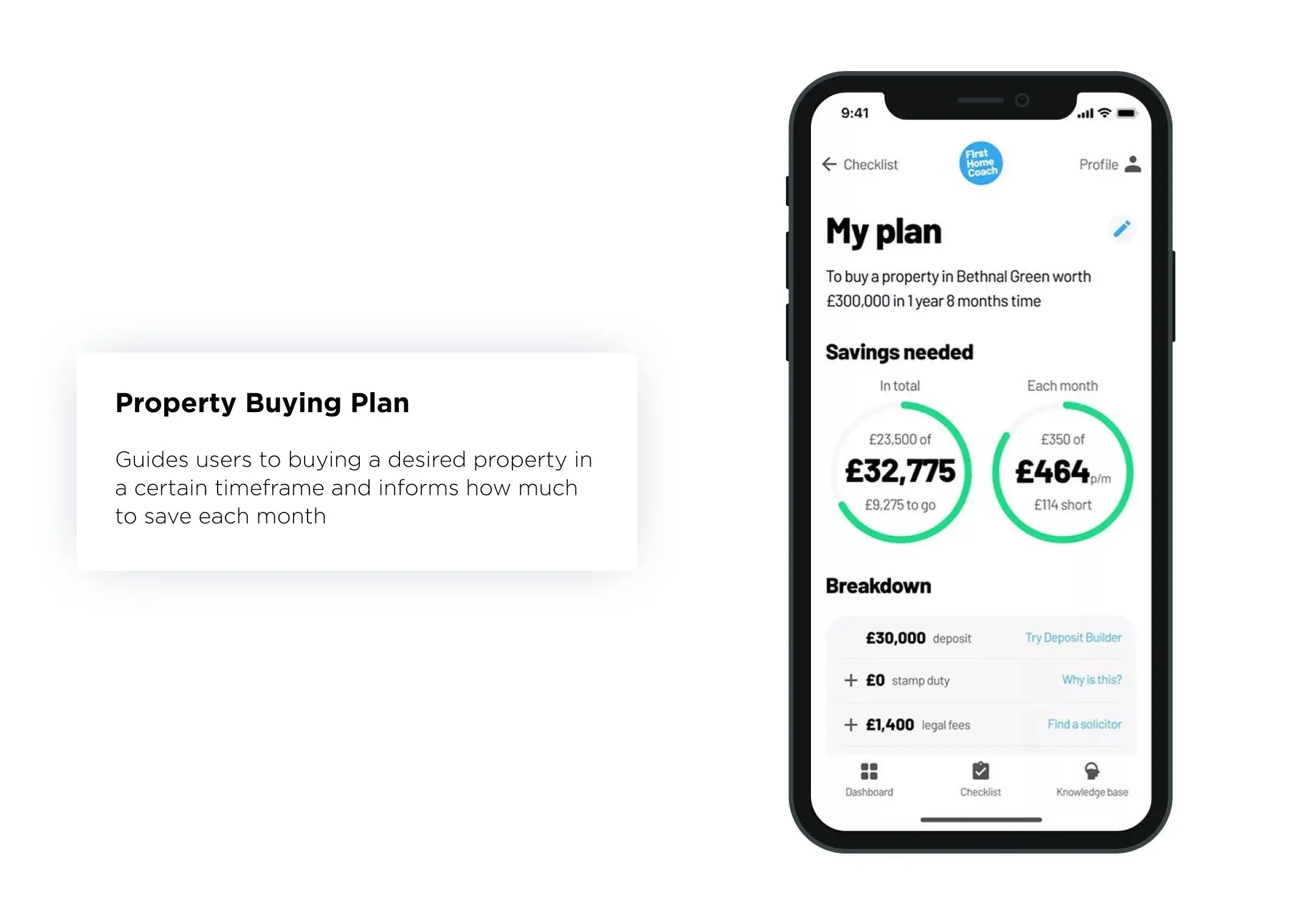 - Property buying plan shows how much a user should save every month to buy a property within a specified timeframe.