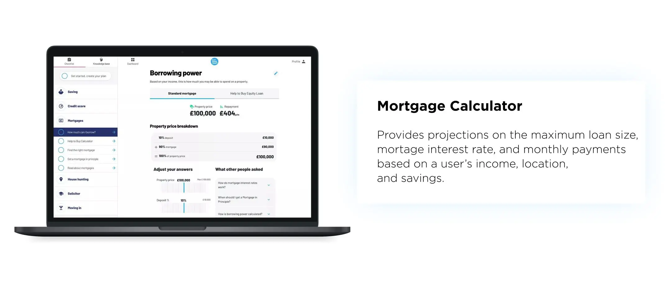 - Mortgage calculator helps users find the best loan model based on their monthly income, savings, and location.