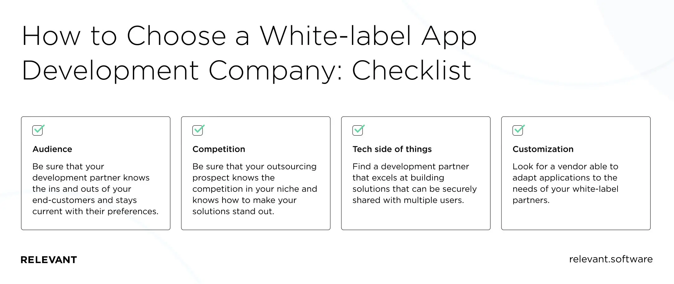 Luckily, you can minimize the risk of losing your partners. When building a white label application, you need to know how to adapt to the current and future business requirements of potential buyers. And a seasoned software development provider, like Relevant, will help you with this.