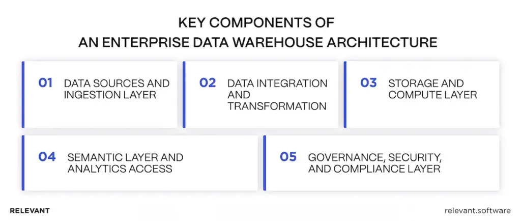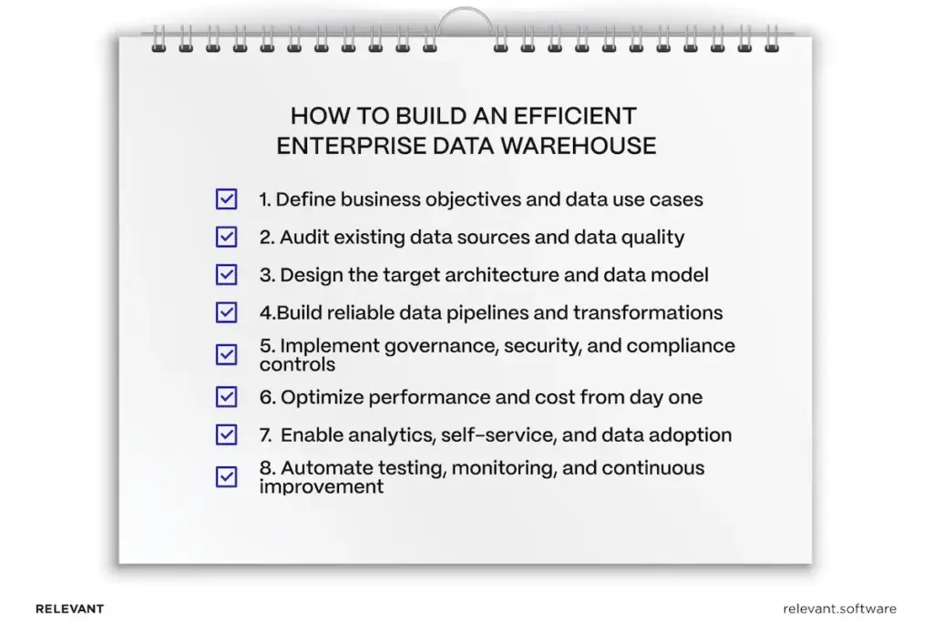 This guide explains how to design an EDW (enterprise data warehouse) that remains fast and controlled as the business grows, with a delivery approach suited to complex enterprises. If you want a clean starting point before implementation, Relevant Software’s data strategy consulting services help you to clarify ownership, source rules, and the target architecture.
