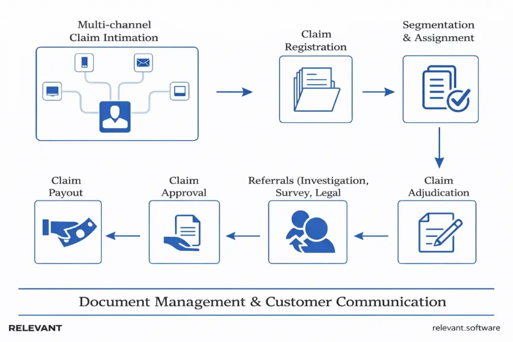 Insurance claims software orchestrates multiple steps across the claims lifecycle. Each stage contributes to speed, accuracy, and operational control.