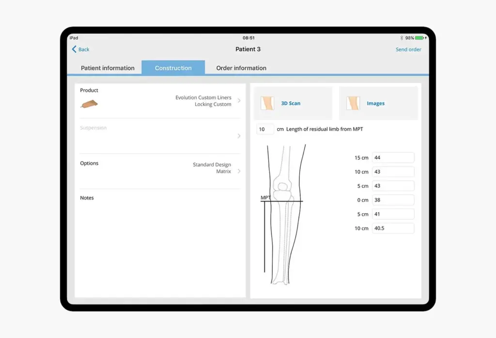 To achieve this, we unified the experience so that both apps operate as one system. SmartMeasure now guides brace selection and records exact knee parameters through a clear, stepwise flow. In parallel, Össur Custom Solutions manages sockets and liners while preserving patient context end to end. Finally, we integrated Structure Sensor 3D to capture transtibial geometry with high fidelity. Clean digital scans replace casts, and the courier step disappears.